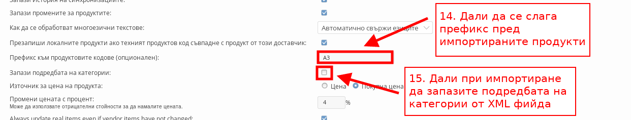 - Със “Запази подредба на категории” задавате дали искате да запазите подредбата на категории от XML фийда и във Вашия магазин при импортиране.