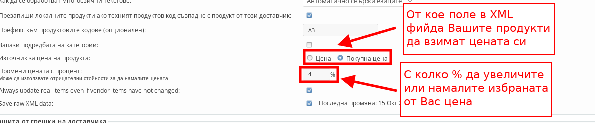- С настройката”Източник на цена” обособявате продуктите Ви от кое поле в XML фийда да взимат цената си – от препоръчаната цена за краен клиент или от покупната цена.