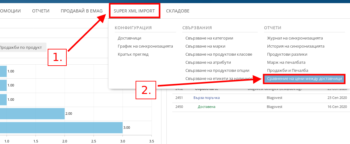 С меню “Сравнение на цени между доставчици” вие можете с лекота да сравнявате цените на продукти както във Вашия магазин, така и с различните доставчици, с които имате синхронизация.