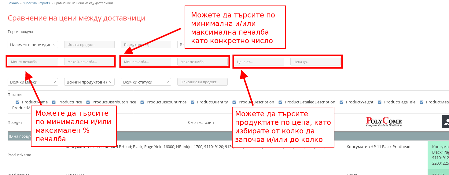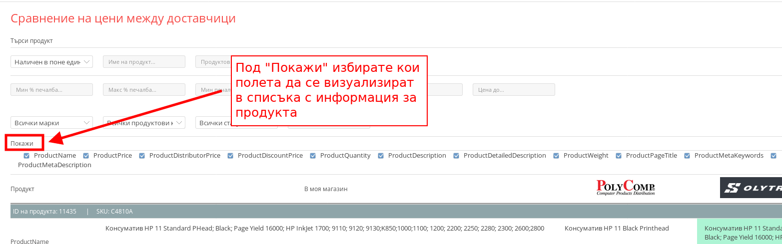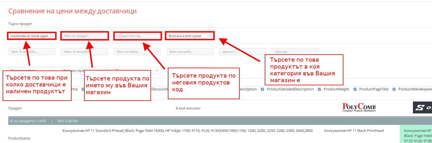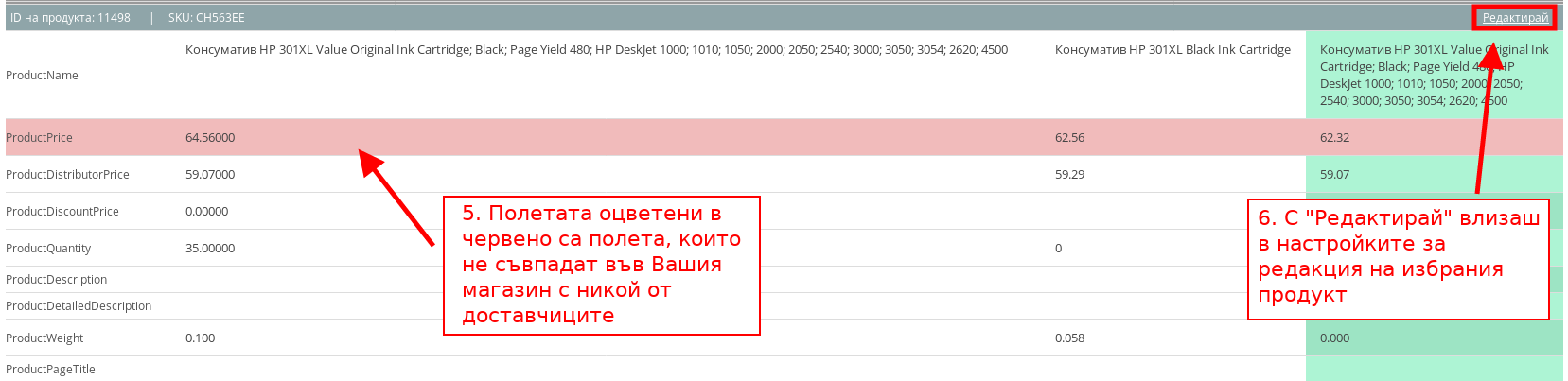 - Редовете оцветени в червено са полета, които не съвпадат във Вашия магазин с нито един от доставчиците.