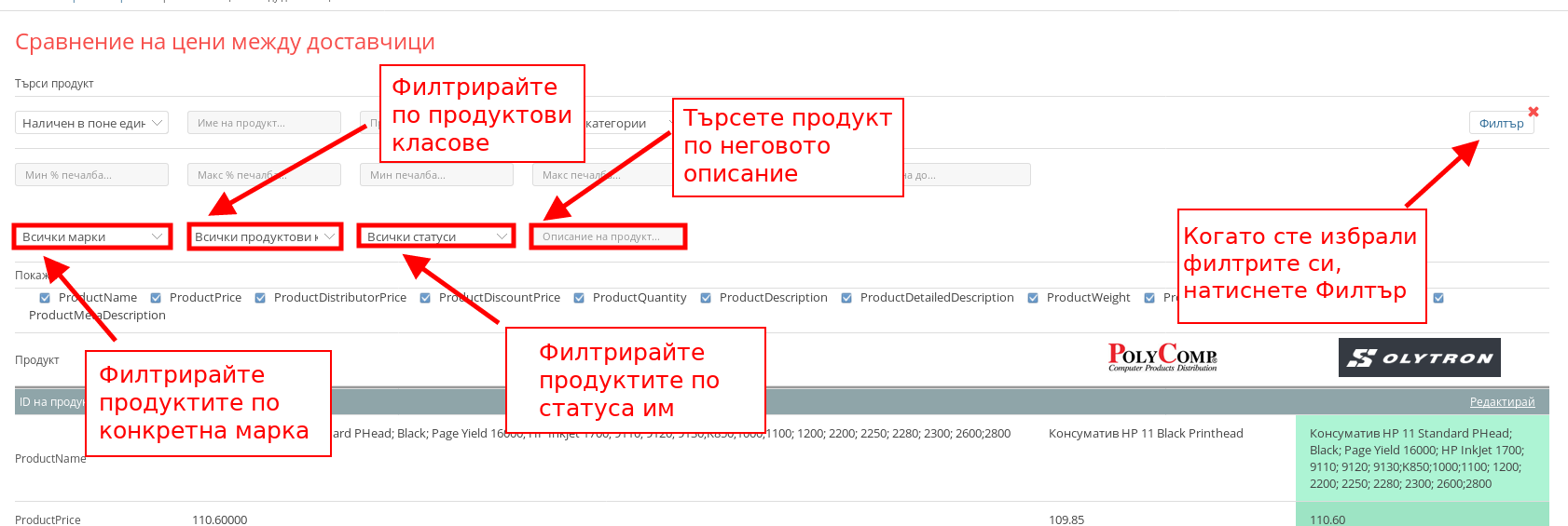 - Под полето “Търси продукт” имате голямо разнообразие от приложими филтри, с които да търсите конкретни продукти, на които искате да сравните цените: