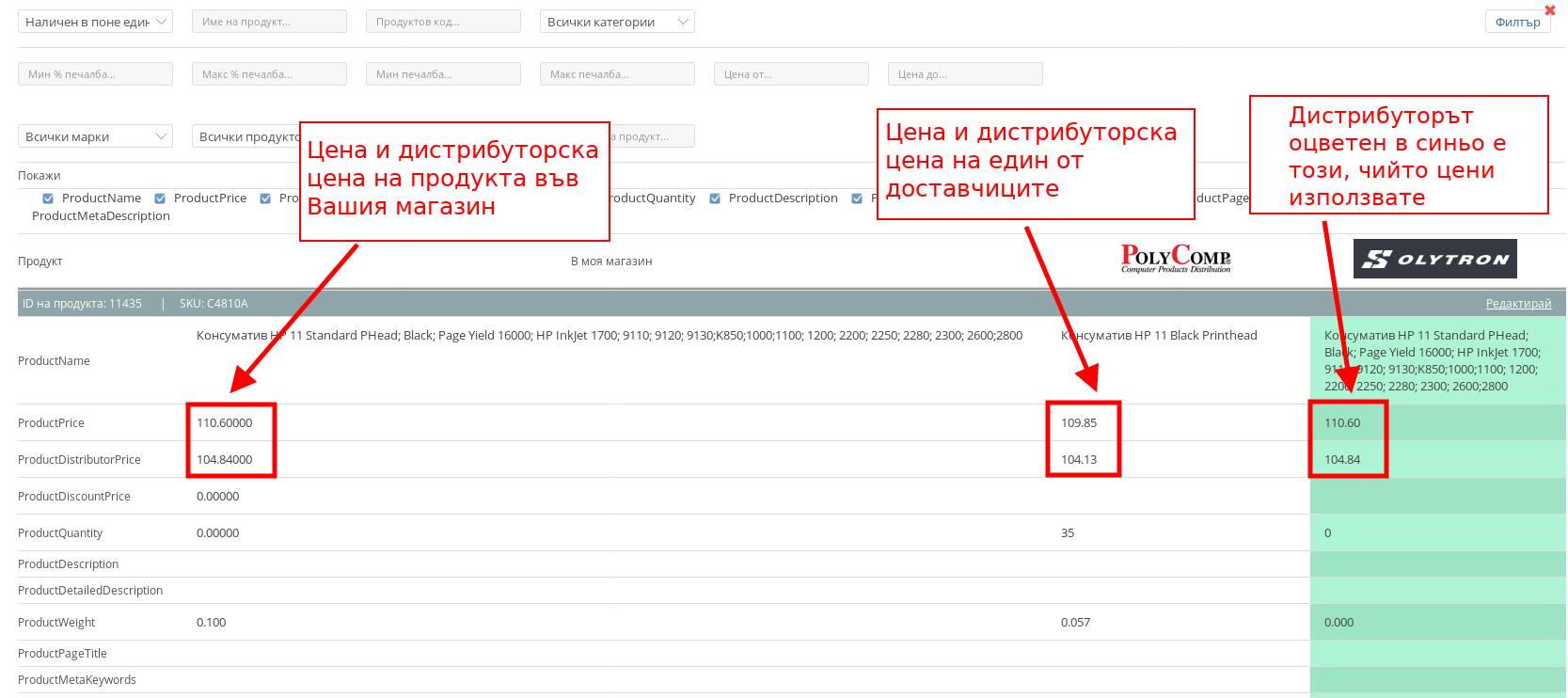 - В най-лявата част на таблицата са разположени цената, дистрибуторската цена и другата информация за продукта във Вашия магазин;