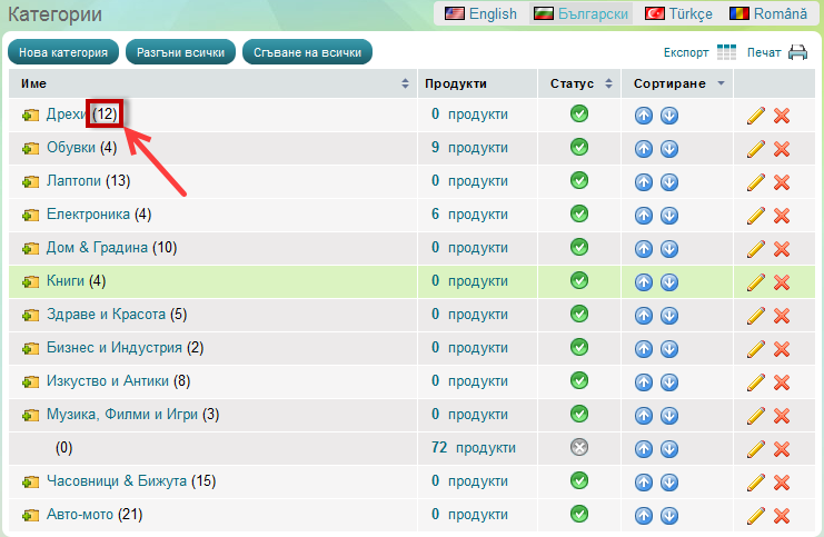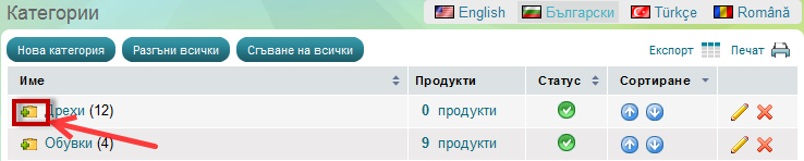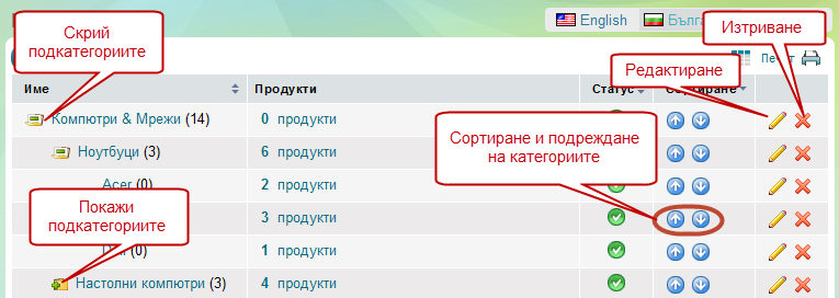 Страницата "Категории" показва всички категории във Вашият магазин, като също така Ви дава свободата да създавате, редактирате, изтривате категории с продукти и пренареждате вече създадените от Вас категории.