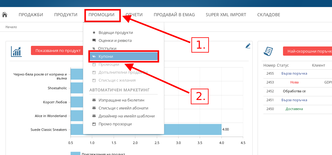 - За да създадете купон във Вашия административен посочете меню Промоции и натиснете върху “Купони”.