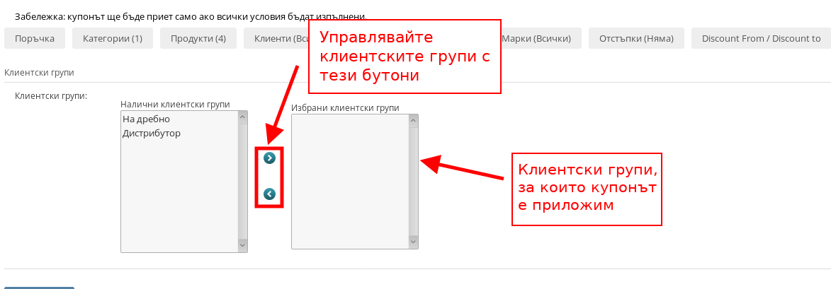 В раздел “Клиентски групи” можете да настроите купонът да е приложим само за избрани от Вас клиентски групи.