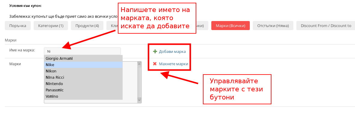 В раздел “Марки” избирате дали купонът да важи само за избрани от Вас марки, примерно ако искате да предлагате купон за -25% за всички артикули на Nike за определен период от време. За да използвате условието, напишете името на марка (цяло или част от него) в текстовото поле и системата ще визуализира всички марки, които отговарят на въведените от Вас данни. Натиснете върху марката, която искате да добавите и след това натиснете върху бутона “Добави марка”.