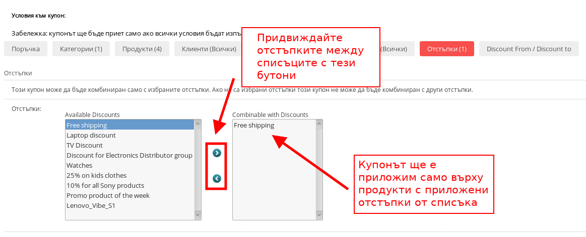 В условие “Отстъпки” избирате с кои отстъпки да може да бъде комбиниран купонът. Примерно, ако създавате купон за -20% на избрани продукти, можете да добавте да е приложим само върху продукти, които имат зададена отстъпка “Безплатна доставка”, ако изберете тази отстъпка в списъка.