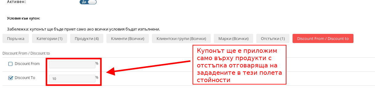 С това условие можете да настроите купонът да е приложим само върху продукти, които имат процентно намаление отговарящо на стойностите, които Вие посочите. Ако искате купонът да е приложим върху продукти намалени с -10% или по-малко в условието ще приложите стойност “Discount to: 10%”.