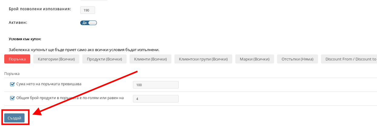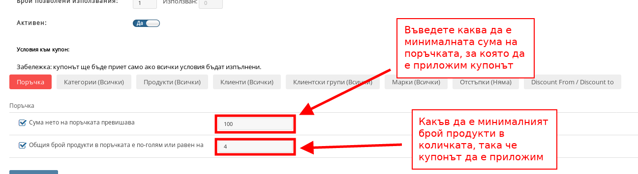 В този раздел можете да управлявате каква е минималната нетна сума, върху която да е приложим купонът, както и какъв е минималният брой артикули в поръчка за да може той да се прилага: