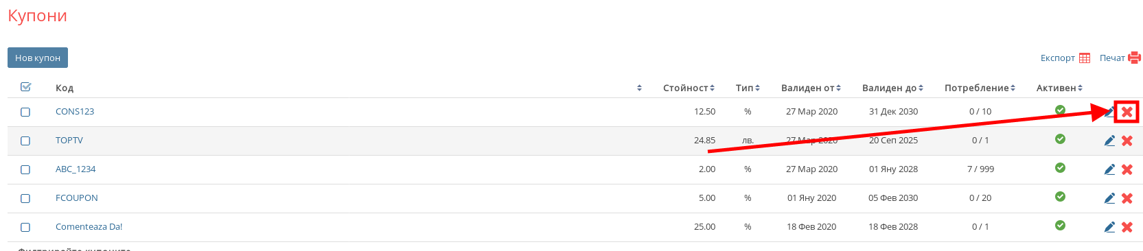 За да изтриете купон, в списъка Ви с купони намерете този, който желаете да премахнете и в дясната част на реда му натиснете червения бутон хикс.