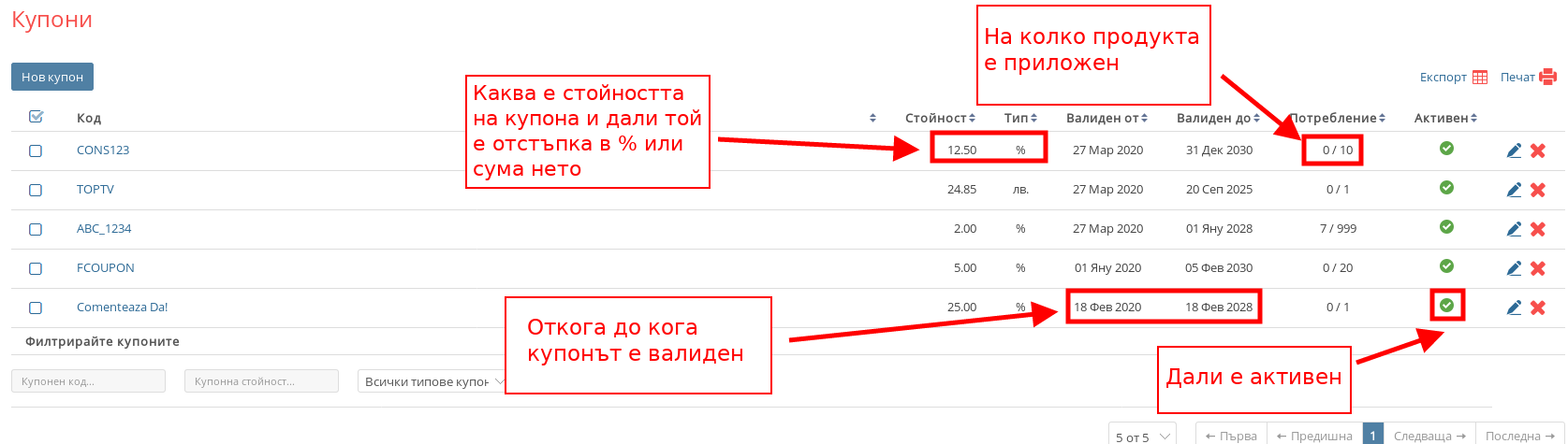 В списъка с купони можете да видите вече създадените и техните характеристики: