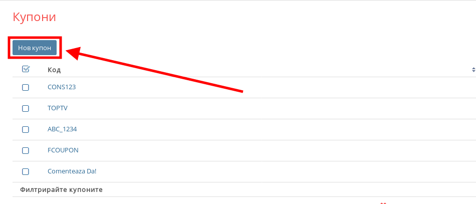 - Натиснете бутона “Нов купон” за да влезнете в менюто за създаване на купон.