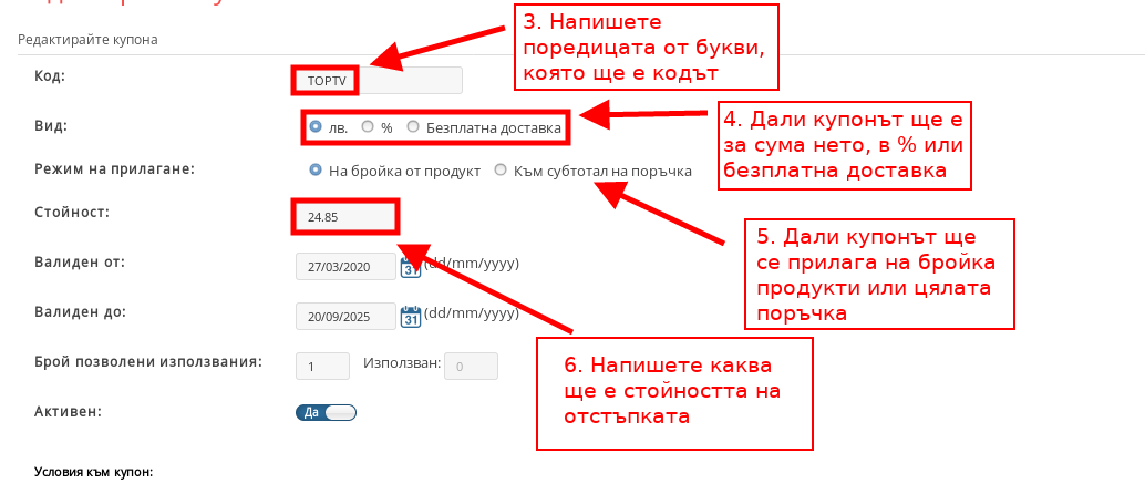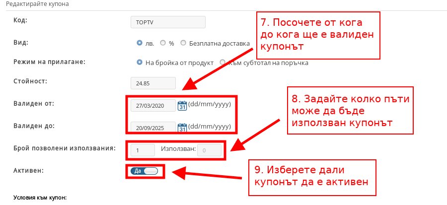 - С бутона “Активен” можете да включвате и изключвате купона, независимо какви други настройки са приложени за него.