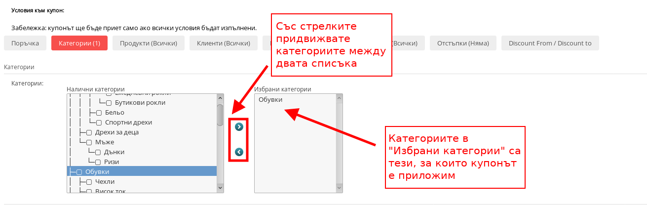 Тук посочвате за кои категории да е приложим купонът. Ако оставите полето празно, купонът ще е приложим за всички категории във Вашия магазин, а ако добавите конкретни категории, то той ще е приложим само към тях (тези в списък “Избрани категории”).