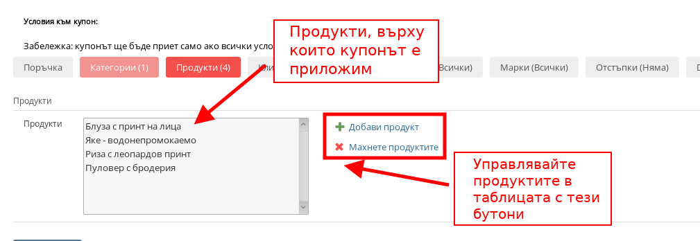 В раздел “Продукти” управлявате купонът и задавате той да е приложим само и единствено върху избрани от Вас продукти.