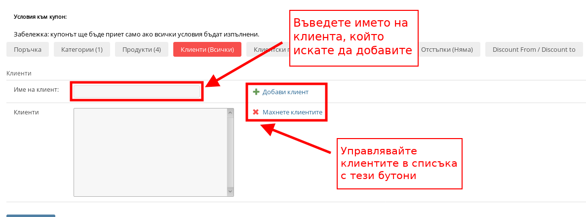 В раздел “Клиенти” можете да настройвате купонът да е използваем само за конкретни клиенти, като можете да ограничите той да важи само за един клиент или за повече. а да използвате условието, напишете име на клиент (цяло или част от него) в текстовото поле и системата ще визуализира всички клиенти, които отговарят на въведените от Вас данни. Натиснете върху желания клиент и след това натиснете върху бутона “Добави клиент”.