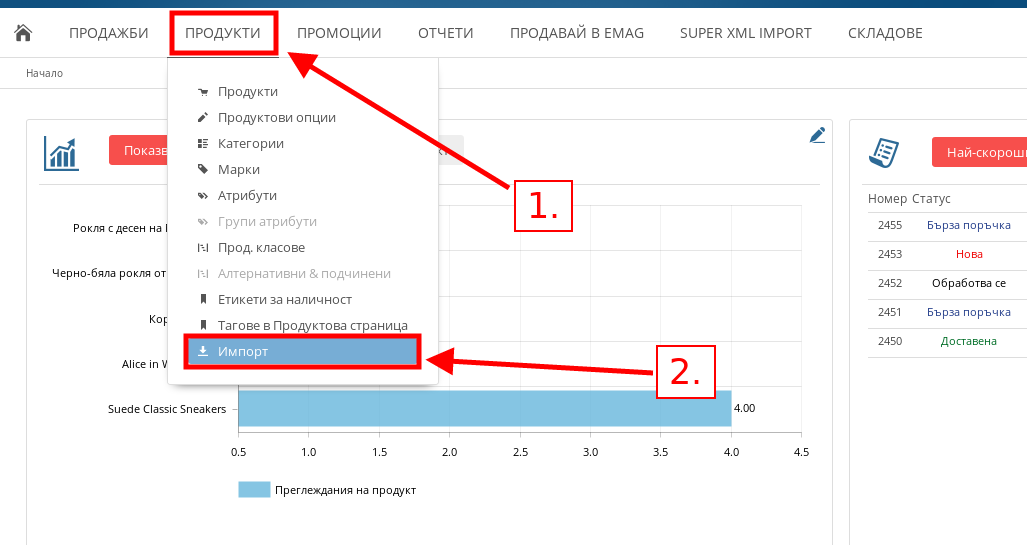 - Във Вашия административен панел посочете Продукти и натиснете върху меню “Импорт”.
