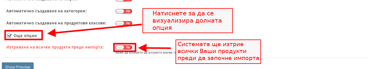 - Ако сложите отметка на “Още опции” ще можете да изберете и настройката “Изтриване на всички продукти преди импорта” - системата първо ще изтрие всички продукти налични във Вашия магазин преди да започне импорта.