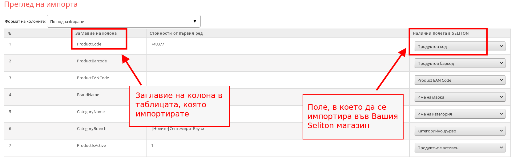- Ще се отвори списък, в който да настроите формата на колоните – можете да видите дали всяко поле от таблицата отговаря на правилните данни от Вашия магазин и ако не – да го настроите.