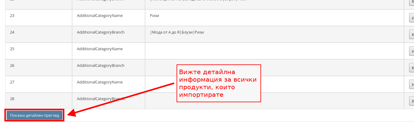 С бутона в долния ляв ъгъл “Покажи детайлен преглед” можете да видите информация за всички продукти, които се импортират от таблицата.