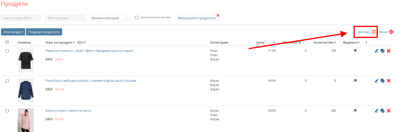 - Можете да изтеглите таблица с информацията за всички Ваши продукти от бутона “Експорт”, който се намира в горната дясна част на списъка Ви с продукти.