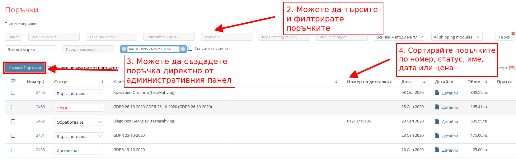В страница поръчки Вие можете да управлявате всички направени поръчки във Вашия онлайн магазин. В нея проверявате дали са направени нови поръчки, можете да актуализирате статуса на вече направени поръчки, да пускате фактури, да разпечатвате товарителници и да повикате куриери за изпълнението им.