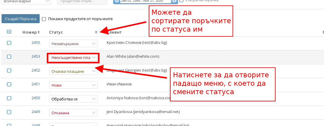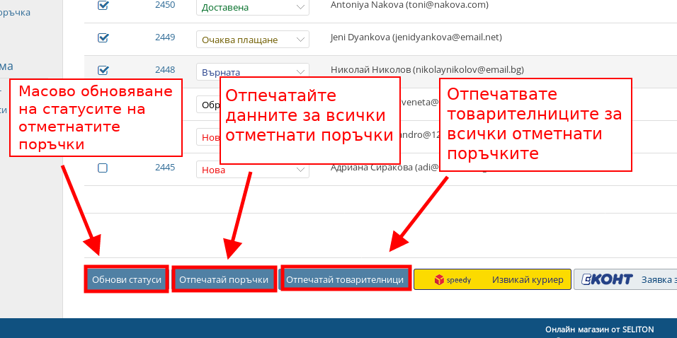 - Обнови статуси – с този бутон задавате новите статуси, които сте избрали за отметнатите от вас поръчки;