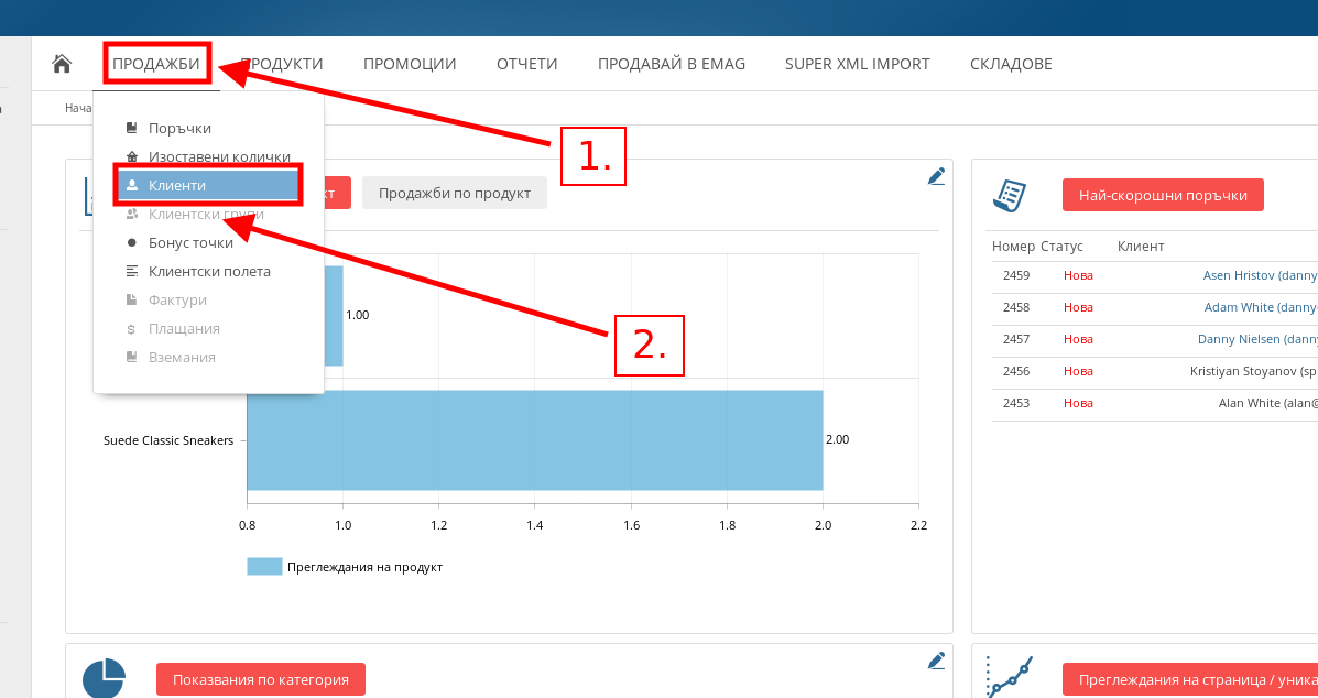 - За да отидете в менюто със списъка Ви с клиенти посочете раздел Продажби и натиснете върху меню “Клиенти”.