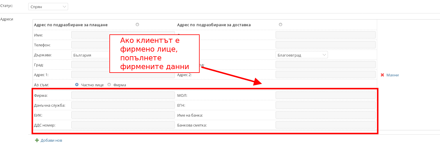 - Ако клиентът е фирмено лице, попълнете фирмените данни.