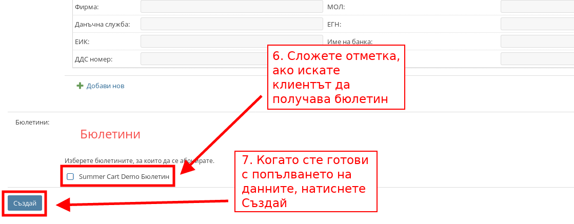 - Ако искате клиентът да е абониран за бюлетин, който изпращате, сложете отметка на кой бюлетин.