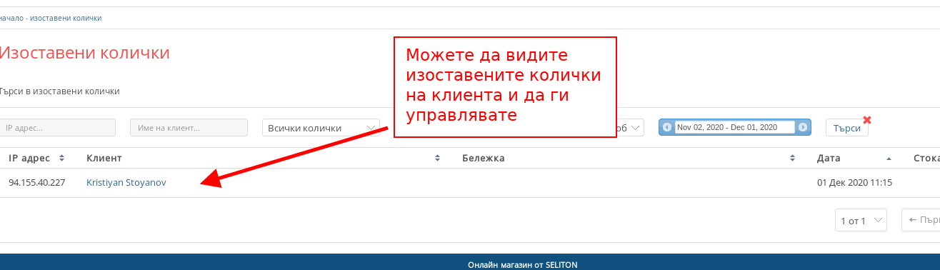 - Под реда “Изоставени колички” можете да видите какви изоставени колички има клиентът и на каква стойност.