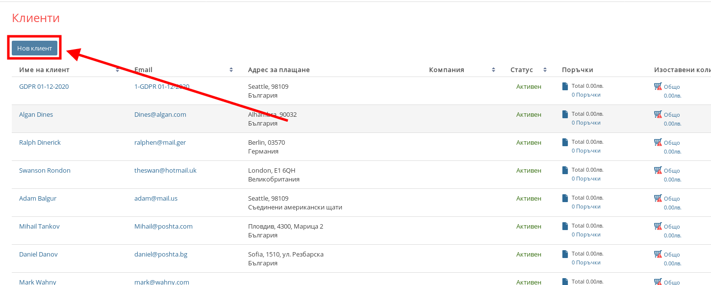 - С бутона “Нов клиент” можете ръчно да създадете нов клиентски акаунт във Вашия онлайн магазин.