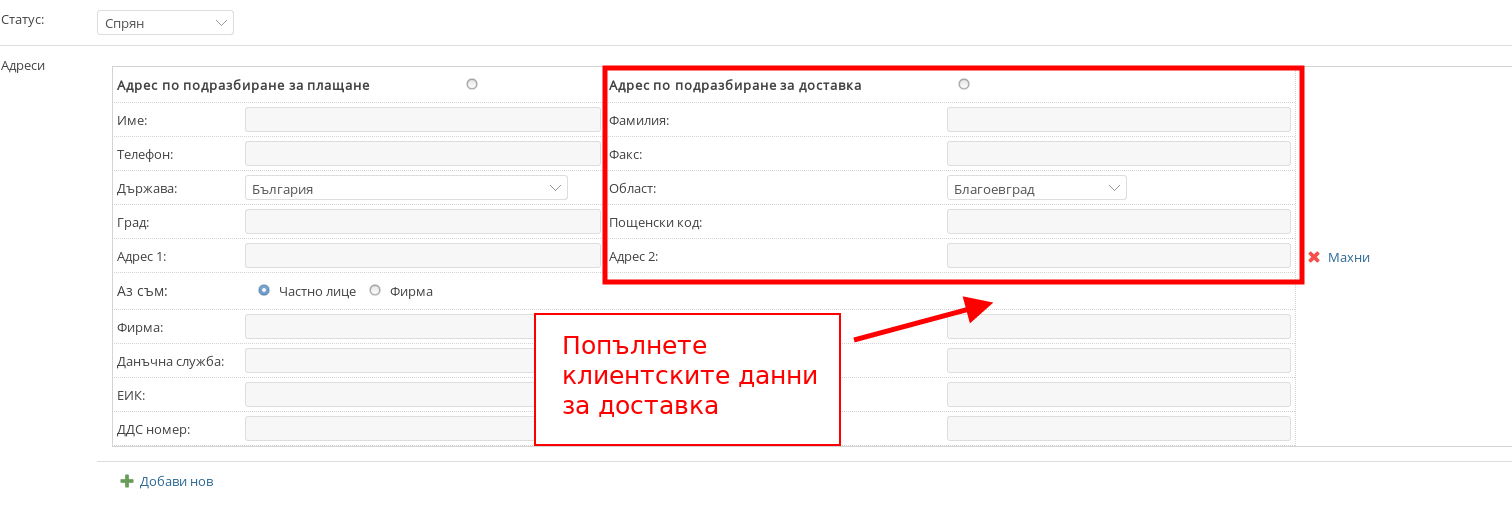 - Попълнете данните за адрес за доставка на клиента, като те могат да са същите като данните за фактура.