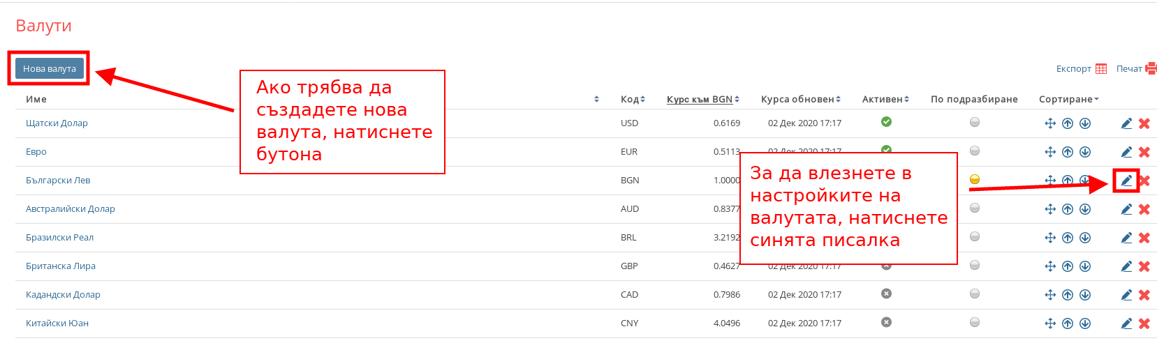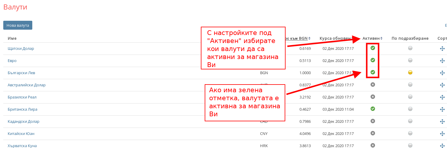 - С бутона “Активен” настройвате дали валутата да е активна във Вашия магазин.