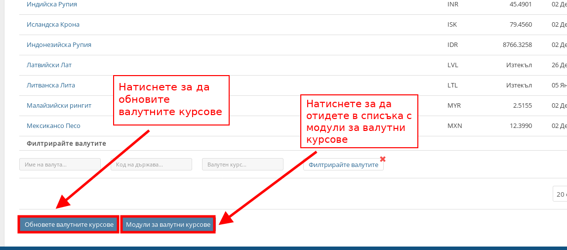 Отляво на бутона “Модули за валутни курсове” пък ще намерите бутона “Обнови валутните курсове”, който можете да натиснете за да актуализирате валутните си курсове.