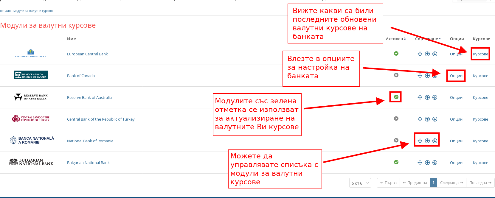 Освен, че можете да активирате валутните курсове, можете да управлявате модулите и по други начини: