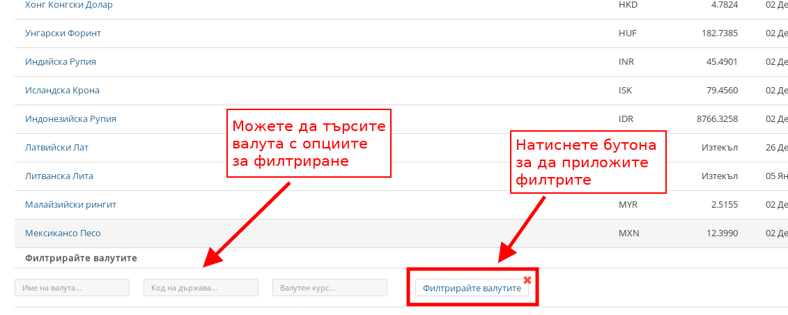 - Ако търсите конкретна валута, в долната част на списъка можете да използвате опциите за филтриране за да я потърсите.