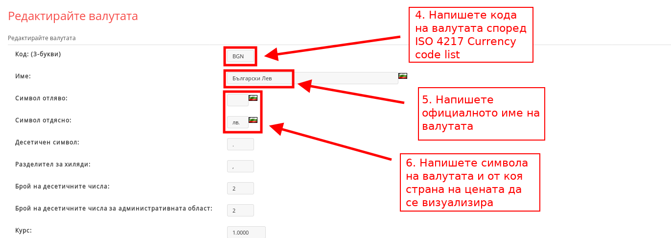 - В полетата “Символ отляво” или “Символ отдясно” поставяте от коя страна на сумата да се визуализира валутният символ. Пример: символът $ се поставя преди цената, тоест отляво. За някои валути символът е отляво, а за други отдясно.