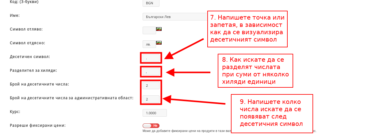 - В полето “Сепаратор за хиляди” напишете как искате да бъдат разделяни числата при суми от няколко хиляди валутни единици – пример: 10 000 / 10,000 / 10.000.