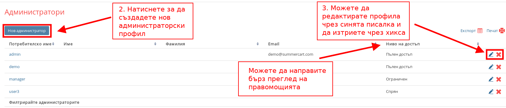 - С бутона над списъка с администратори “Нов администратор” можете да създадете нов администраторски профил в магазина Ви.