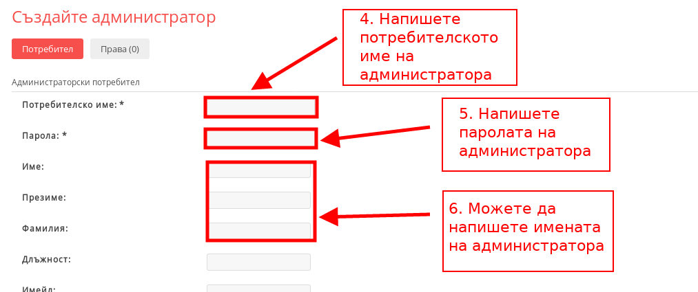 - В полетата “Име”, “Презиме” и “Фамилия” можете да въведете имената на администратора.