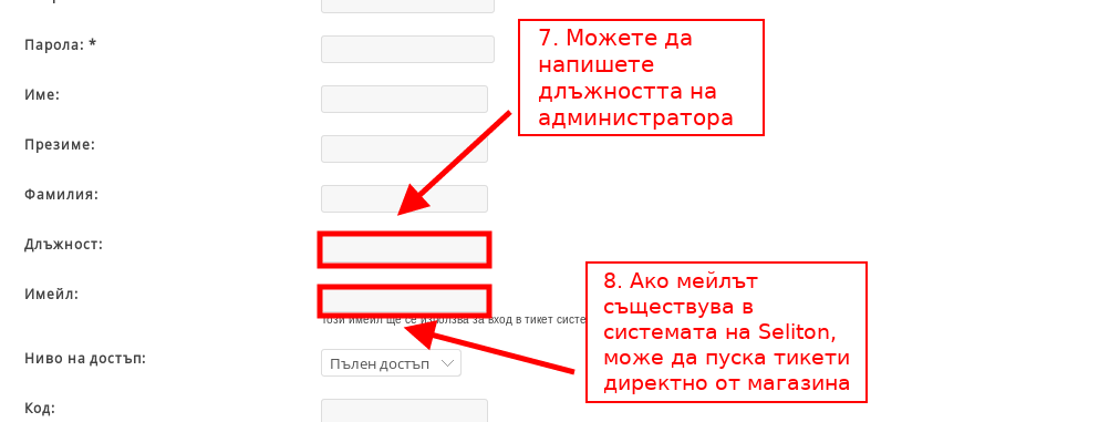 - В поле “Имейл” вписвате имейла на администратора – ако имейлът отговаря на имейл в системата на Seliton, профилът ще може да пуска тикети директно от административния панел на магазина Ви.