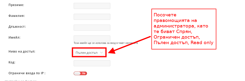- С падащото меню “Ниво на достъп” посочвате какви да са правомощията на администратора, като те биват: