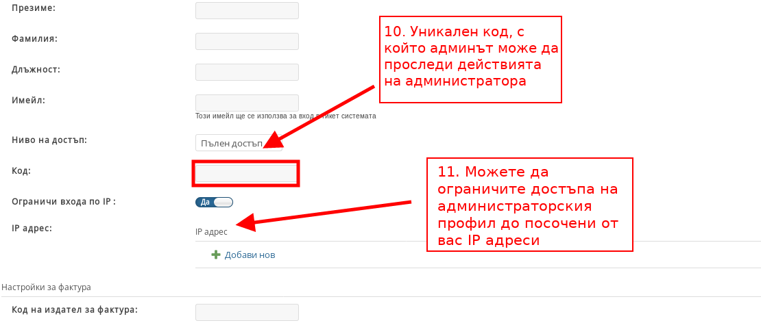- С настройката “Код на издател за фактура” посочвате какъв е уникалният код на администратора, когато издава фактури.