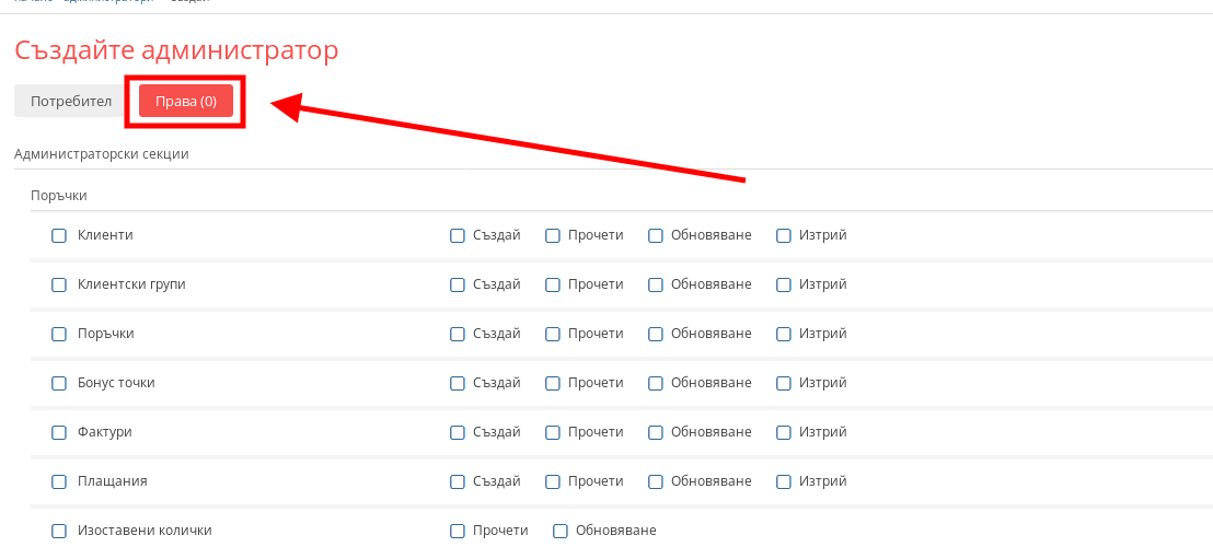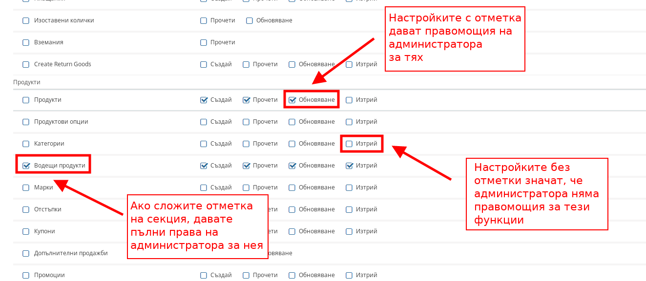 - Ако поставите отметка до Администраторската секция, примерно на “Продукти”, ще дадете пълни правомощия за избраната секция на администратора.