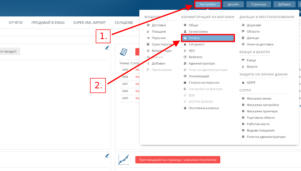 - За да отидете в менюто за настройване на мейли, във Вашия административен панел посочете Настройки и натиснете върху меню “Email-и”.