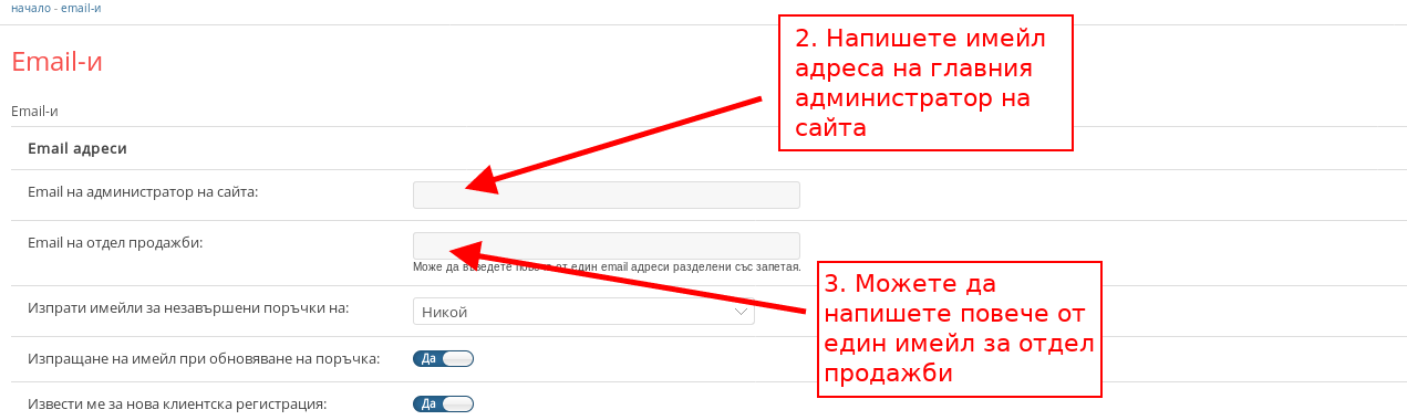 - В полето “Email на администратор на сайта” въведете имейла на главния администратор на онлайн магазина, който да получава известия, ако изберете някоя от настройките за известия.