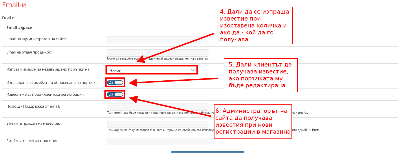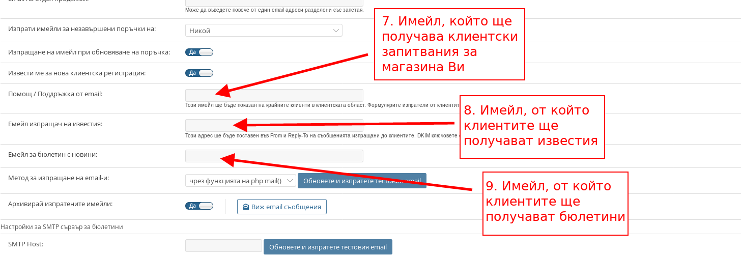 Можете да настроите различните имейл адреси, които да се използват във Вашия магазин – имейл за счетоводни цели, имейл за клиентите, имейл за бюлетини и т.н.