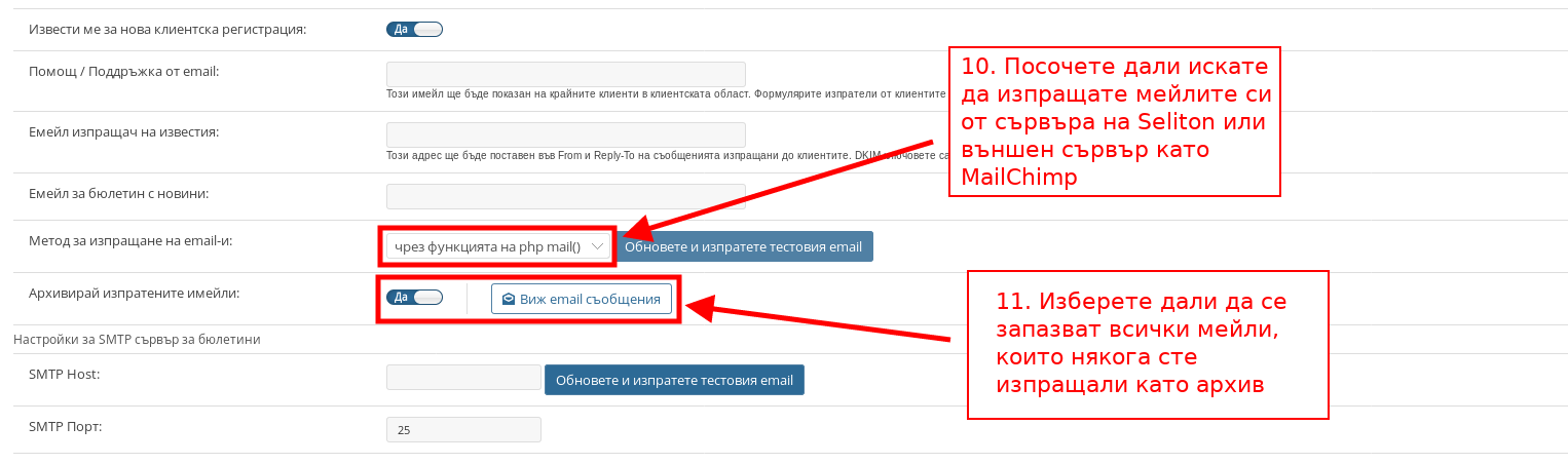 - С настройката “Метод за изпращане на email-и” избирате от кой сървър да изпращате мейлите си. Ако използвате “чрез функцията на php mail” ще изпращате имейли от сървър системата на Seliton, а ако изберете “през SMTP сървър” трябва да напишете данните за настройка на външния сървър – примерен такъв е MailChimp.
