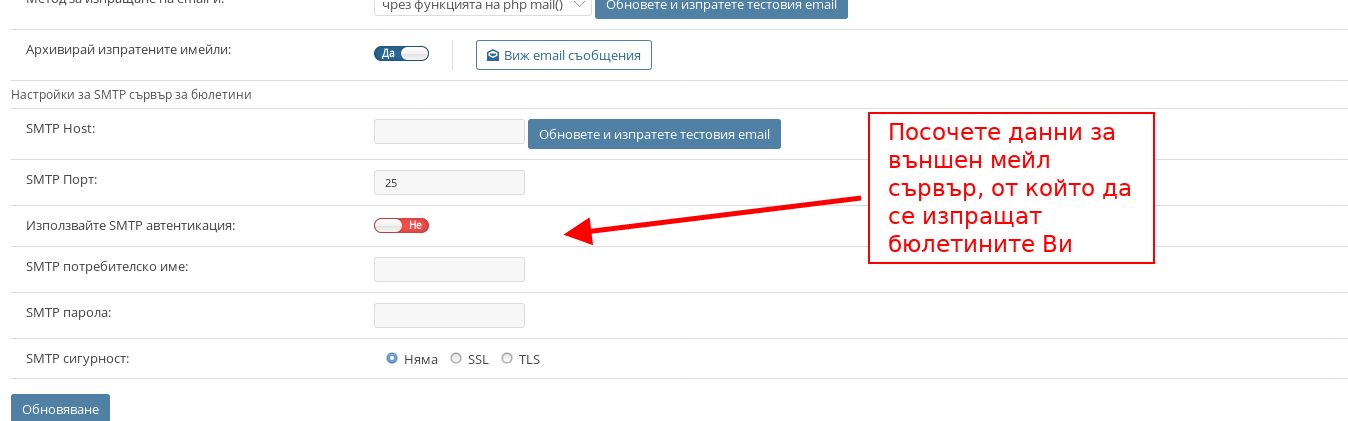 - В подсекцията “Настройки за SMTP сървър за бюлетини” посочвате данните за външен сървър, от който да изпращате имейл бюлетините си.